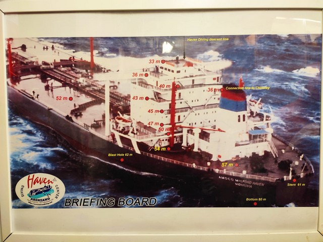 Le MT Haven est une épave qui repose à 80 m de fond au large de Gênes et le haut du château se trouve à 34 m (partie poupe).